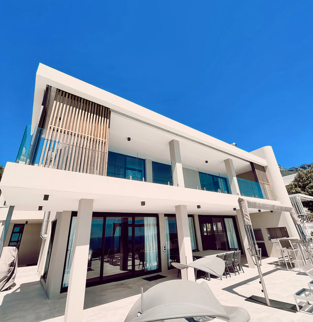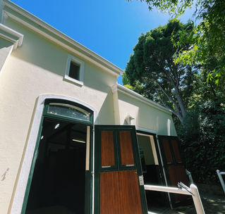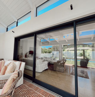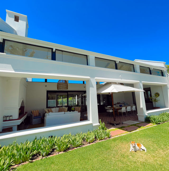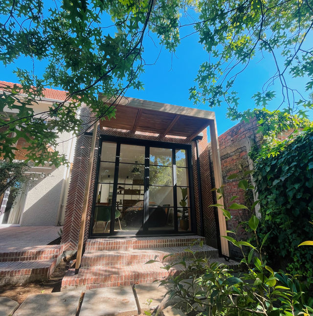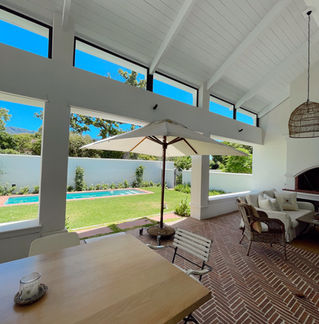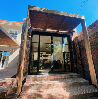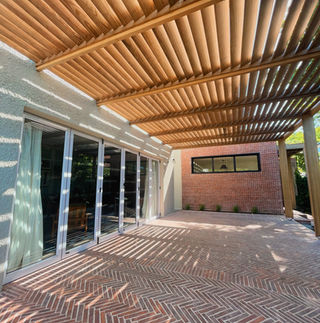 We extended an existing servant quarters into a new guest suite and extended the patio with a Rhino Wood pergola. Cutting edge architecture, especially the half klompie brick wall.